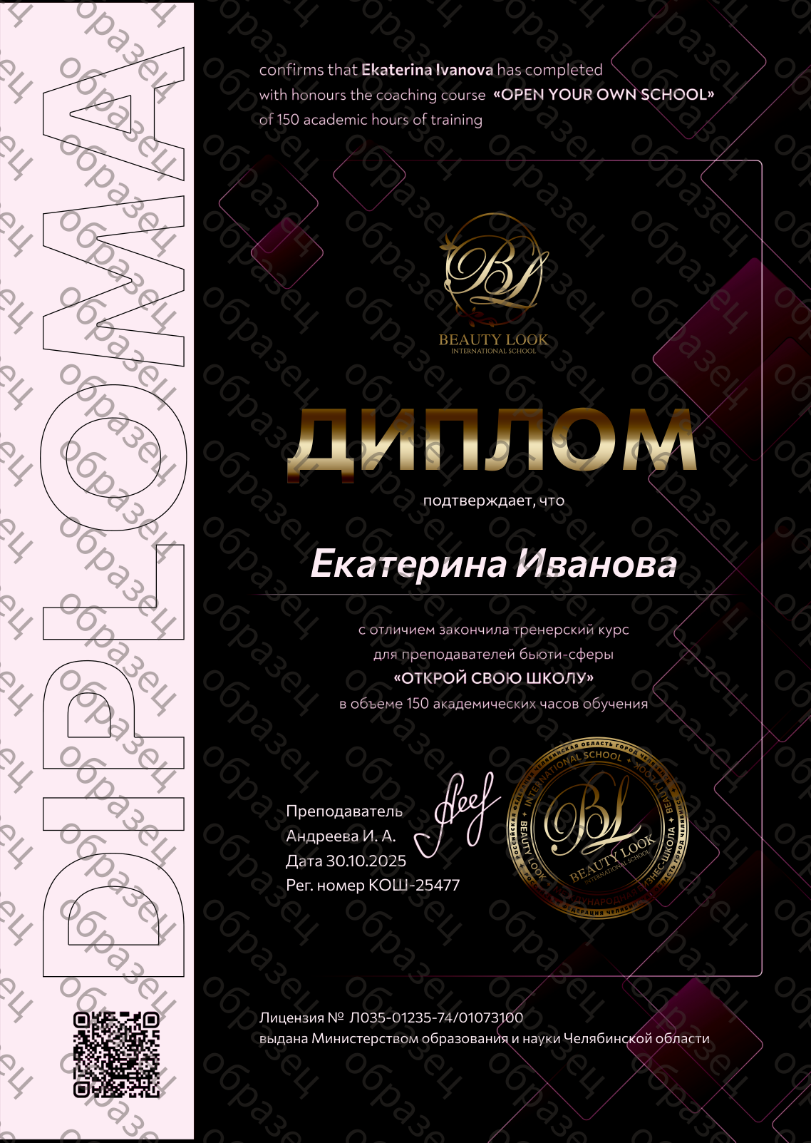 После успешного завершения обучения студенты имеют возможность пройти аттестацию и получить Свидетельство о повышении квалификации на тренера в бьюти сфере на тарифах ALL INCLUSIVE и VIP